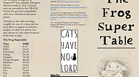 The final versions of the pamphlet with some kick-ass illustrations of the frogs, two new random tables for more froggy flavor, and three original magic items, are now available...